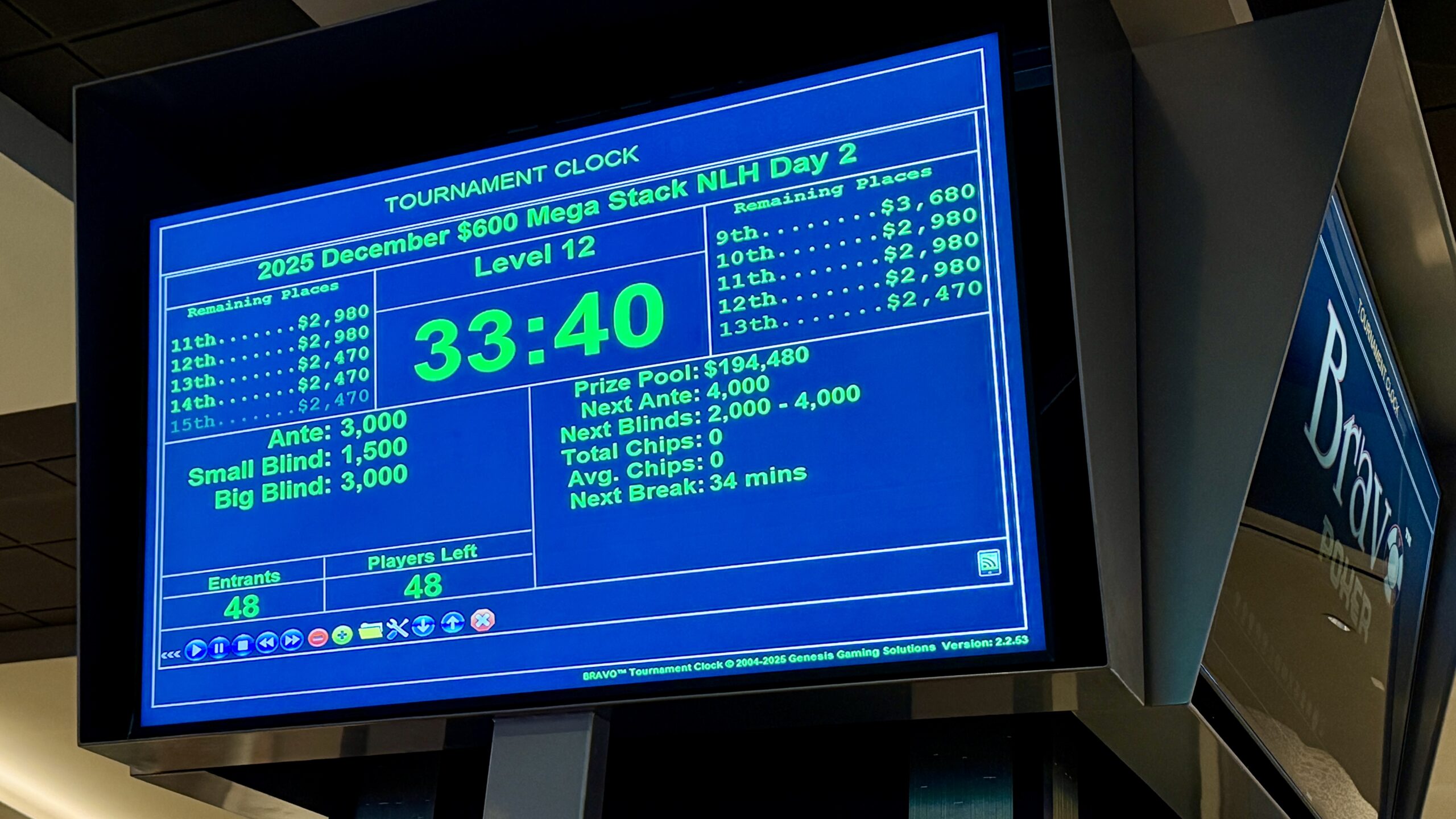 Day 2 Resume level 12 33:40 Blinds 1,500/3,000 with a 3,000 Ante