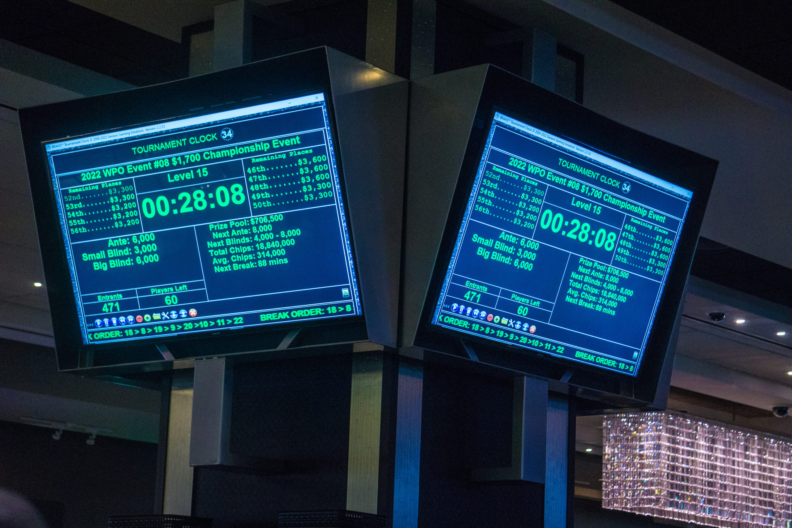 Halfway through Level 15, the Championship reached 60 players to put the field on the money bubble. Tournament staff paused the clock to play hand-for-hand until one player is eliminated with two minutes coming off the clock for each hand.