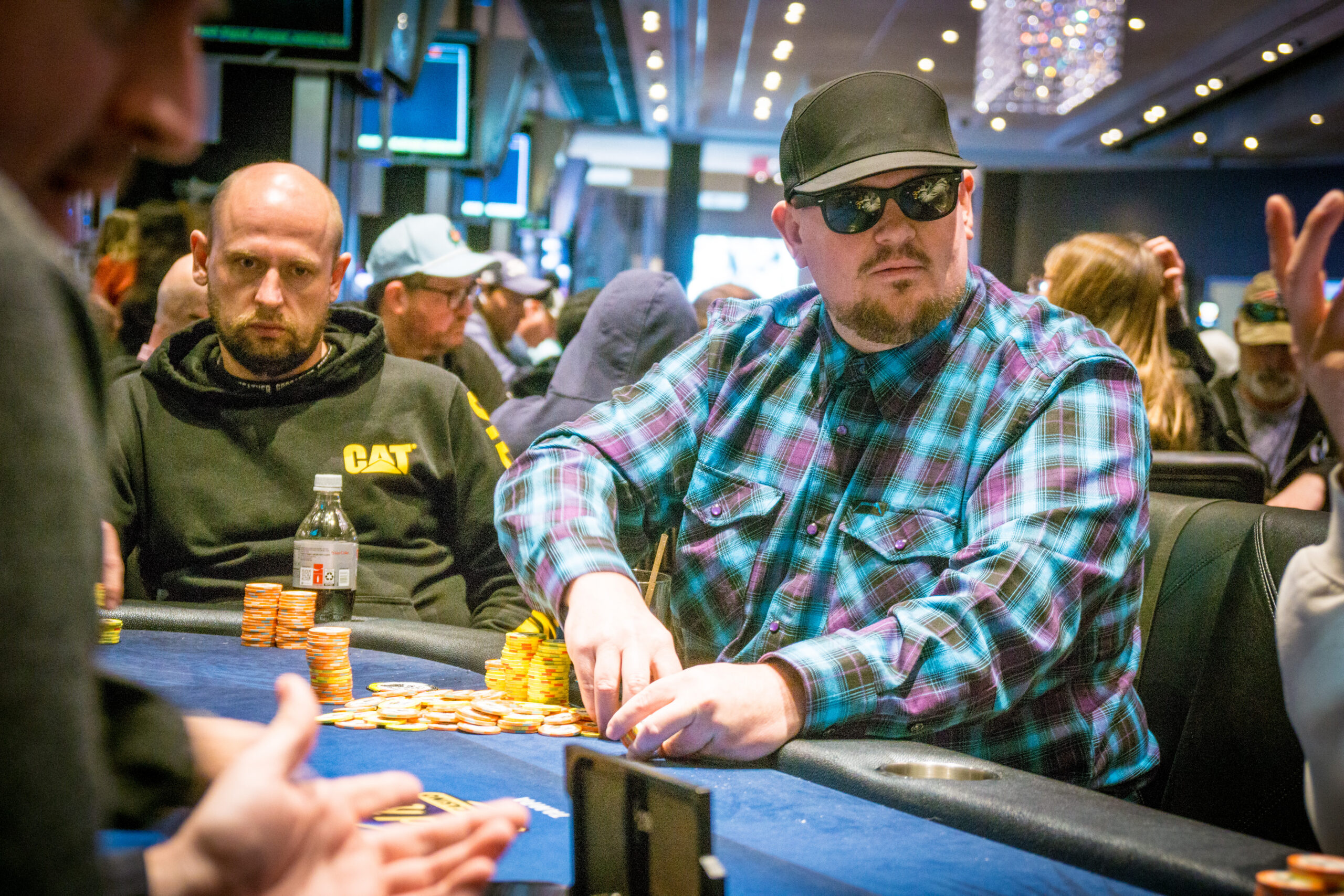 flop and three-way action. The big small blind player was all in for 135K, the cutoff was also at risk for 156,000 and John Two-Bears had them both covered.