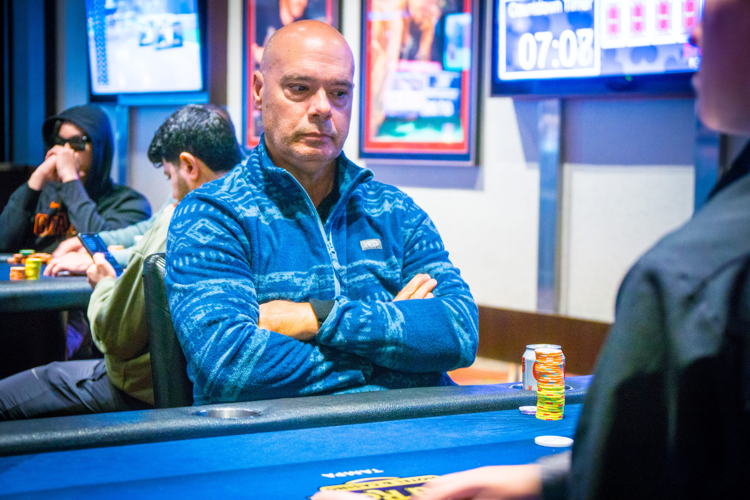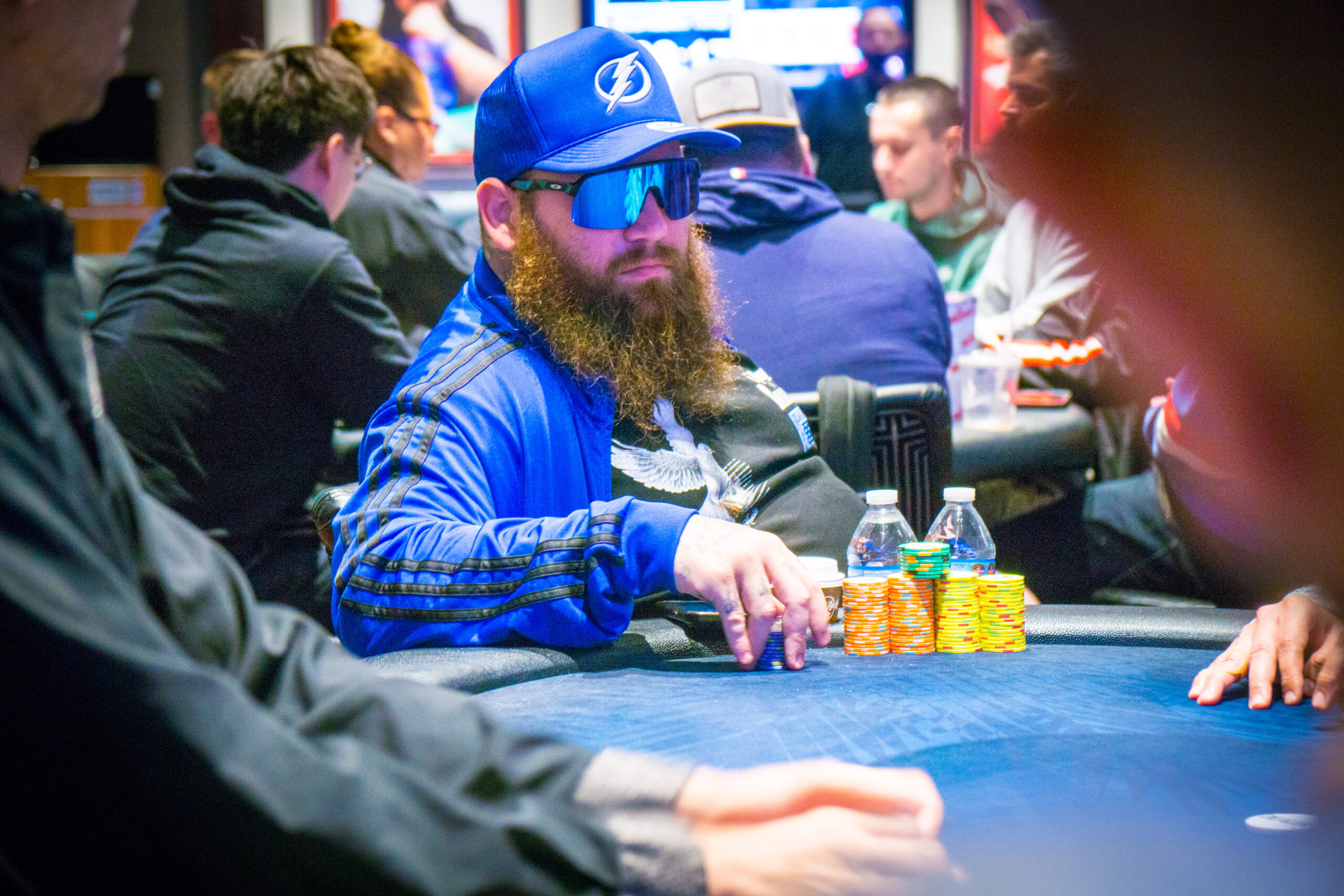 “Beard” Smith was the chip leader at the start of Day 2 and he’s still at the top with 534,500. Rusty Wadsworth is up to second with 485,000 followed by Justin Zaki with 479,000 and Michael Silva with 439,000.