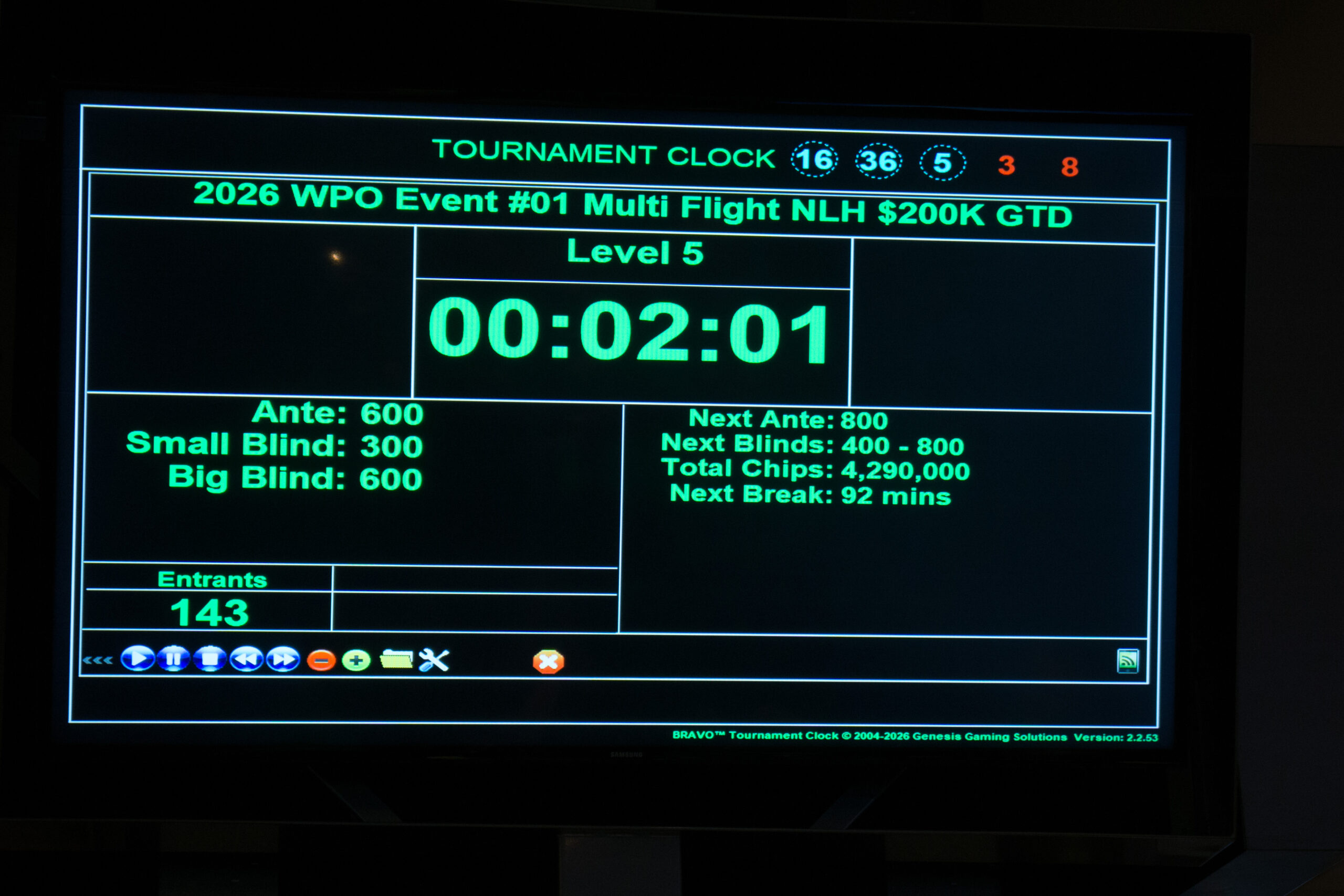 No long after the first break, the 143rd entry of Flight E took a seat and WPO Event 1 officially surpassed its $200,000 guarantee. We have more than 600 combined entries so far with a busy weekend in progress.