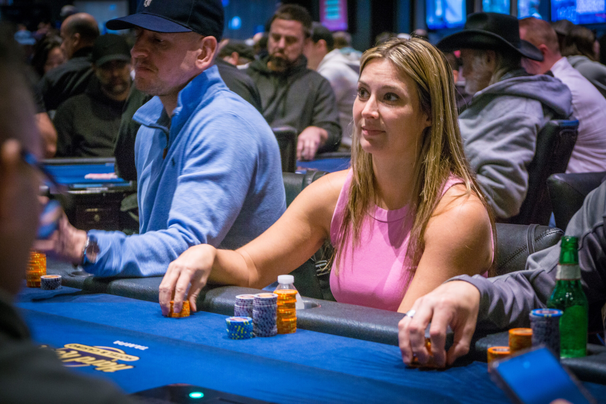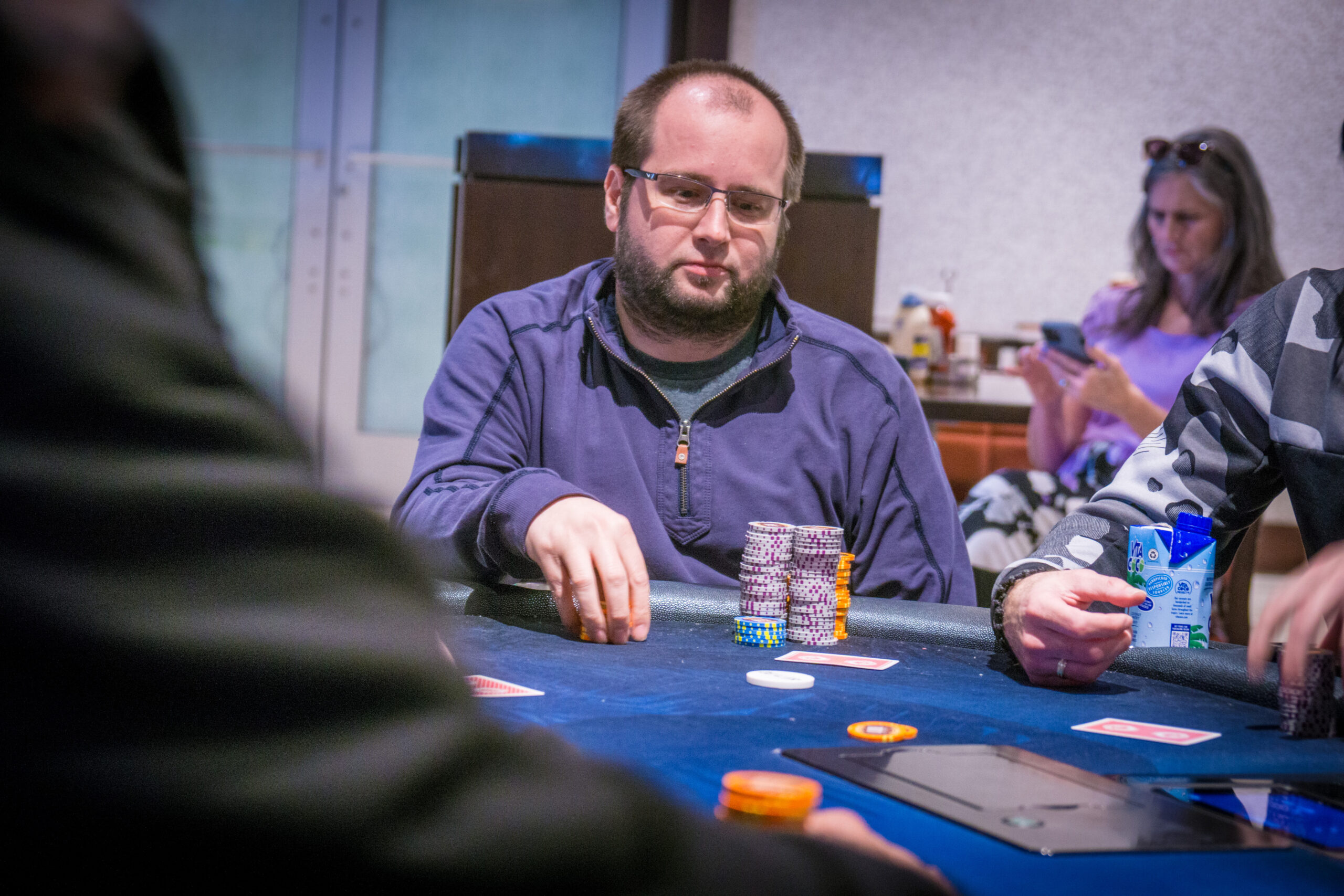 Players returned from their last break after tournament staff pulled the purple chips out of play. They are down to 68 so we can start looking at the money bubble in the near future.