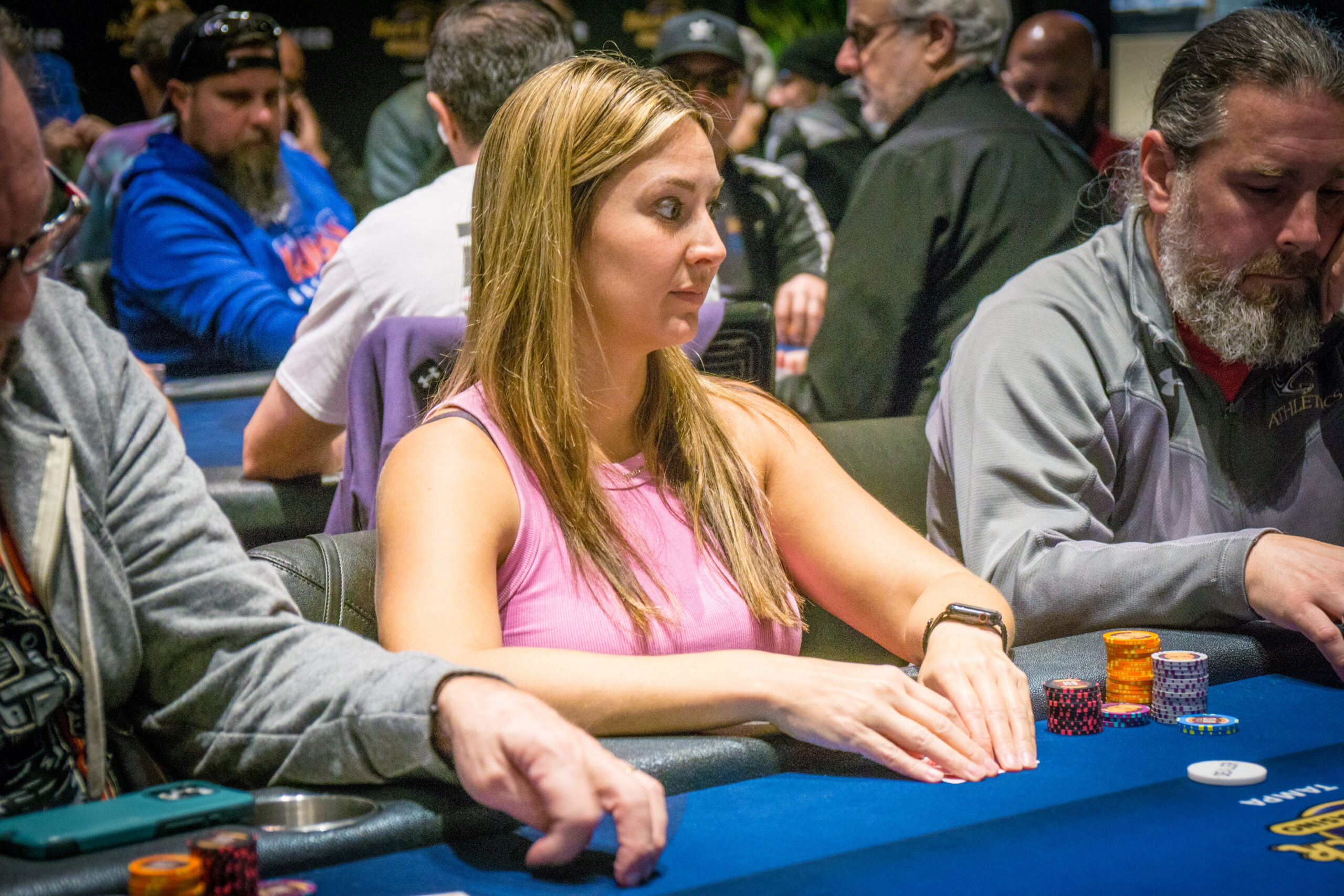 So friends in the field include James Calderaro (who earlier lost aces to kings and queens after running two outers), Ashley Spring, Igor Tretyakov, Maribeth Hilliard, Cheri Ivan, Jennifer Haselton, and Riley Price.