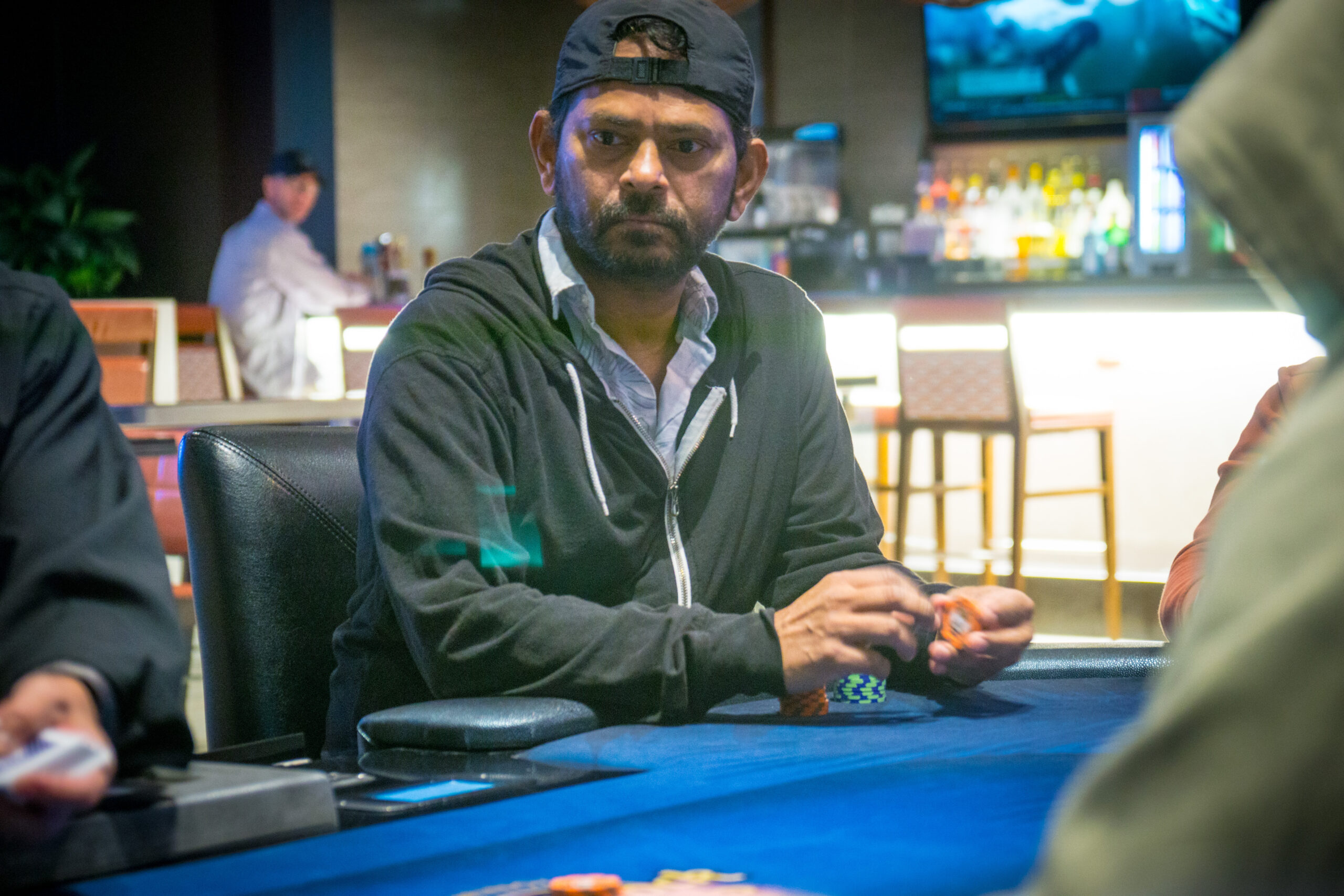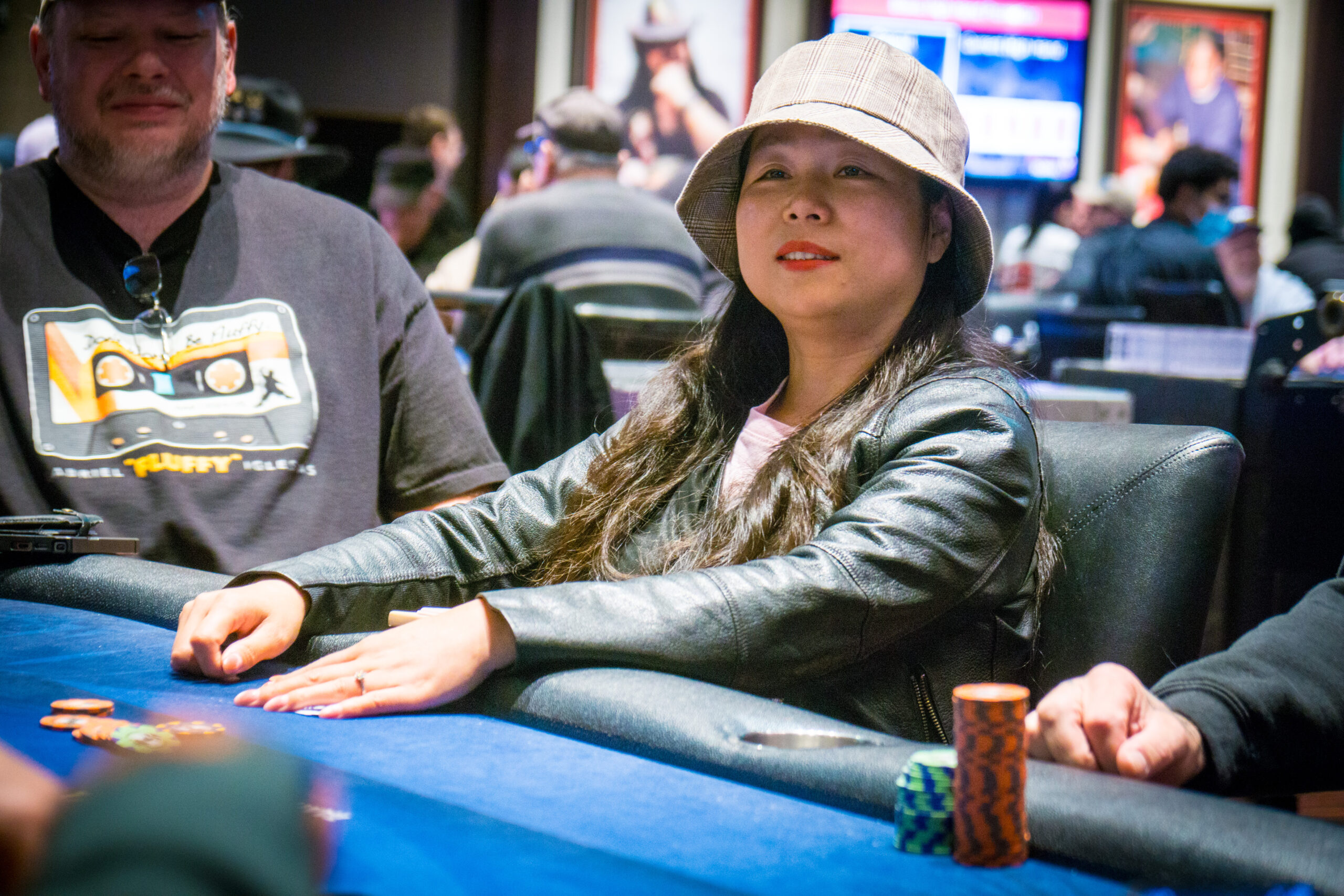 Hongxing Li opened to 160,000 from middle position, leaving a single 5K chip behind, and Stephen Dees moved all in for 375,000 from the cutoff. It folded back around, Li teased about a possible fold, but called at risk.