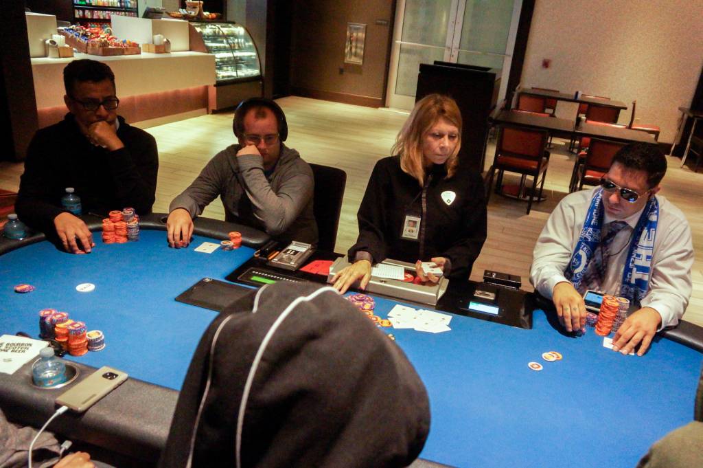 A handful of tables have already broken as the Day 2 field has narrowed from 146 starting to about 126 remaining late in Level 15. Start-of-day chip leader Carlos Rodriguez Rojas and second in chips Mirza Sopovic began the day tables apart, but some luck of the draw now finds the pair seat together as Sopovic joined Table 11 just moments ago.