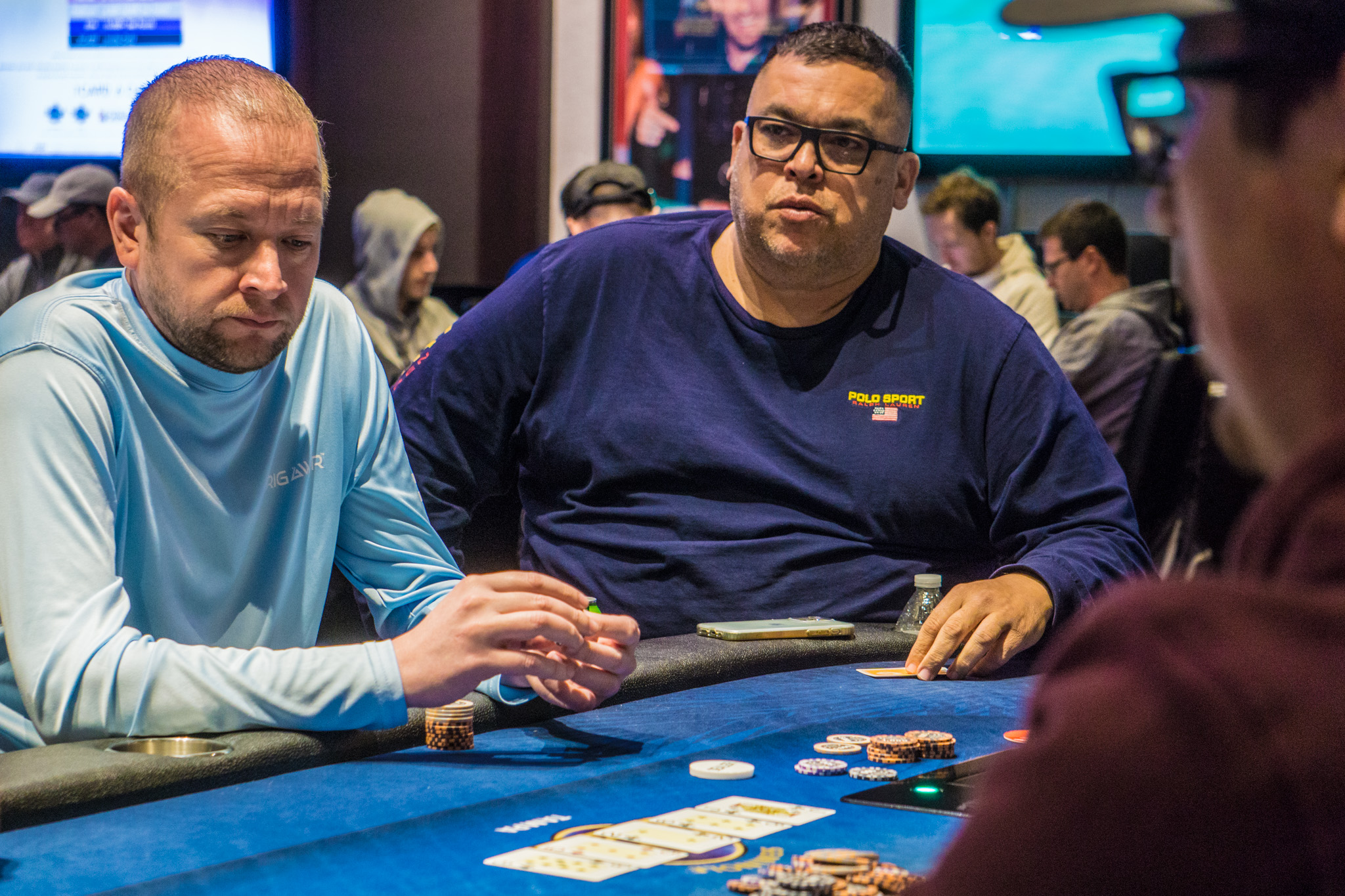 , Al Gomez moved all in for 21,100 from the small blind with about 38,000 in the pot already. His opponent on the other end of the table took a few minutes to think it through, determined the price was right, and called with the bigger stack.