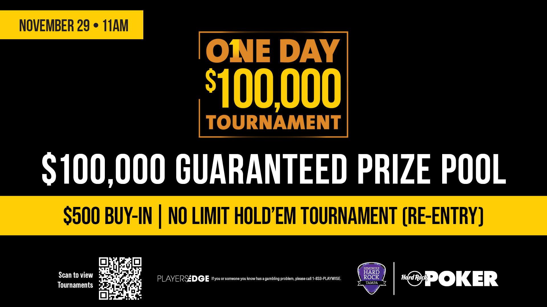 | Sat, Nov 29 | 11:00 AM | $500 | One Day 100K No Limit Hold'em (RE) - $100,000 GTD | Structure Sheet |