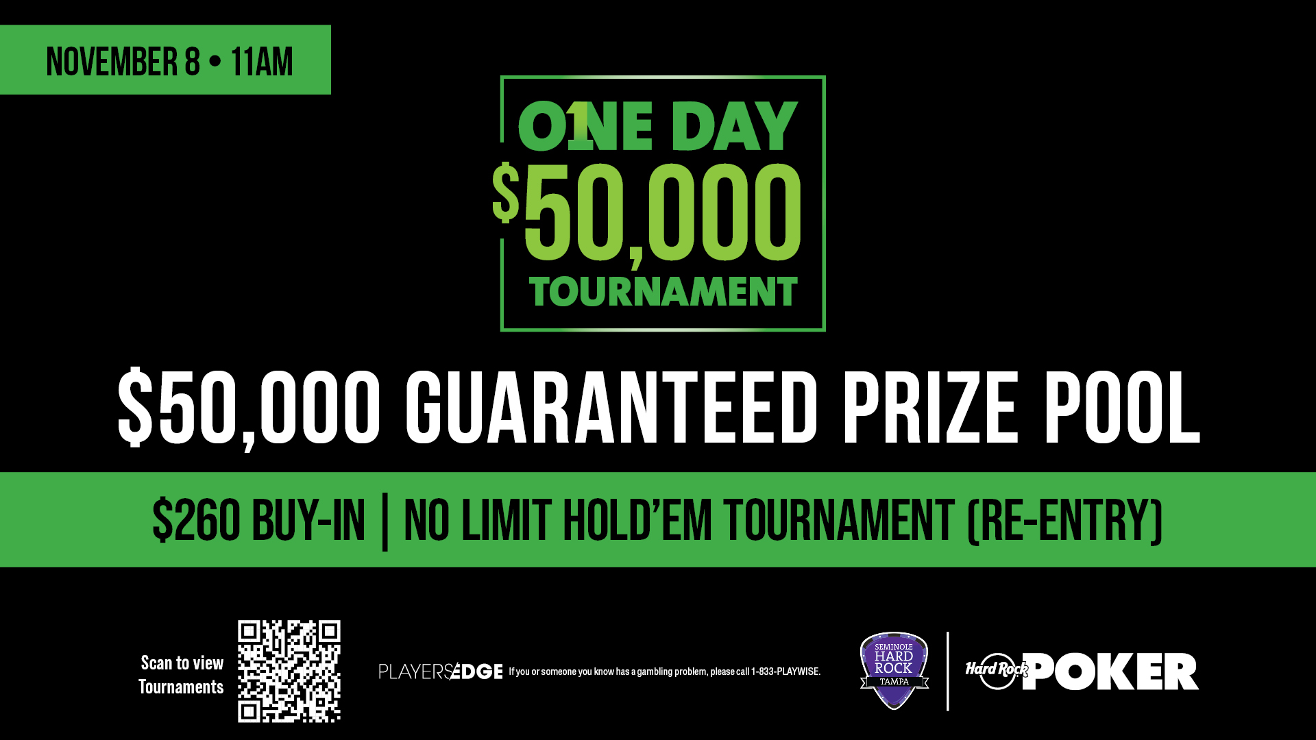 | Sat, Nov 08 | 11:00 AM | $260 | One Day 50K No Limit Hold'em (RE) - $50,000 GTD | Structure Sheet |