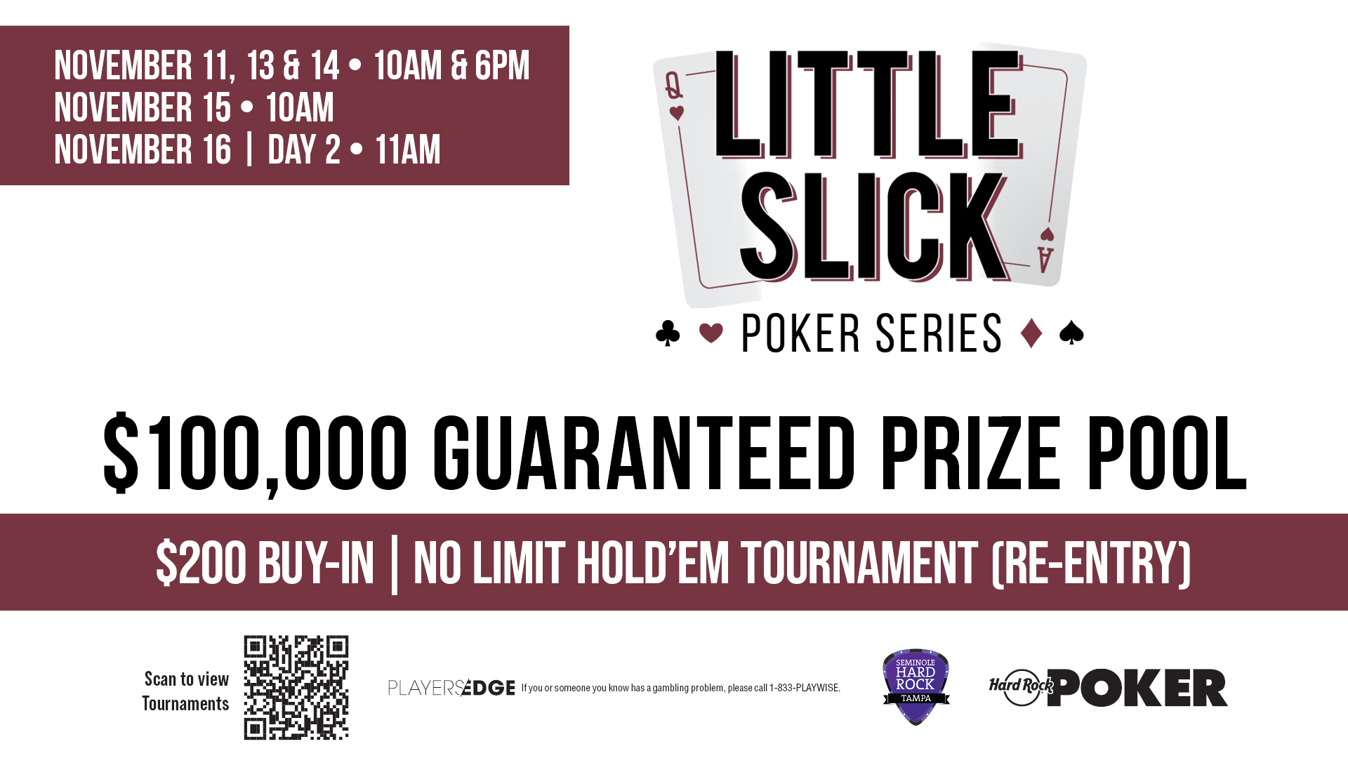 | Fri, Nov 14 | 6:00 PM | $200 | Little Slick No Limit Hold'em (RE) - $100,000 GTD - Day 1F | Structure Sheet |