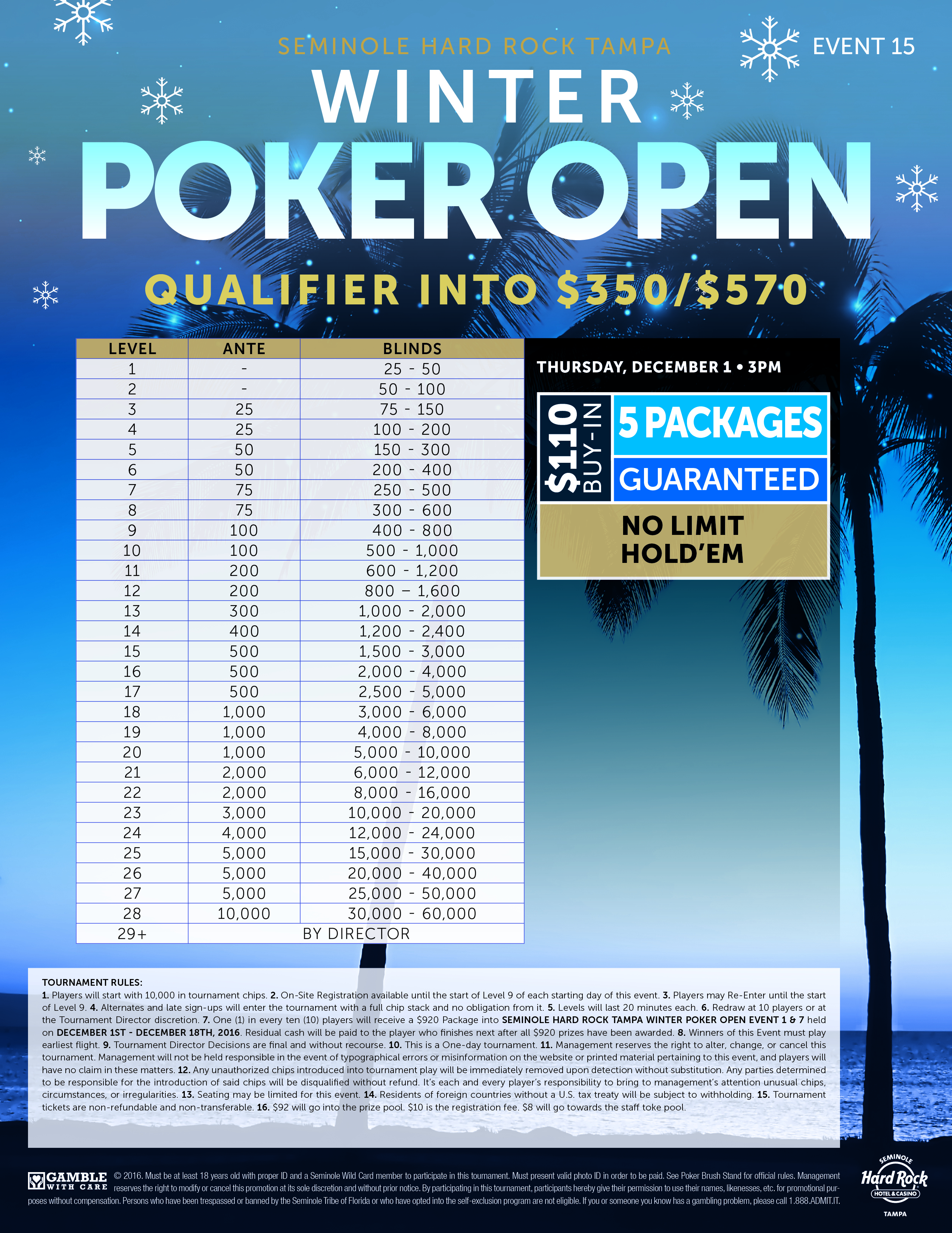 - Day 1 will end after Level 14 or Tournament Director discretion