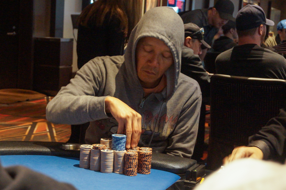 The remaining 15 players are in the midst of a 40-minte dinner break. Cards go back in the air at roughly 7:30pm.