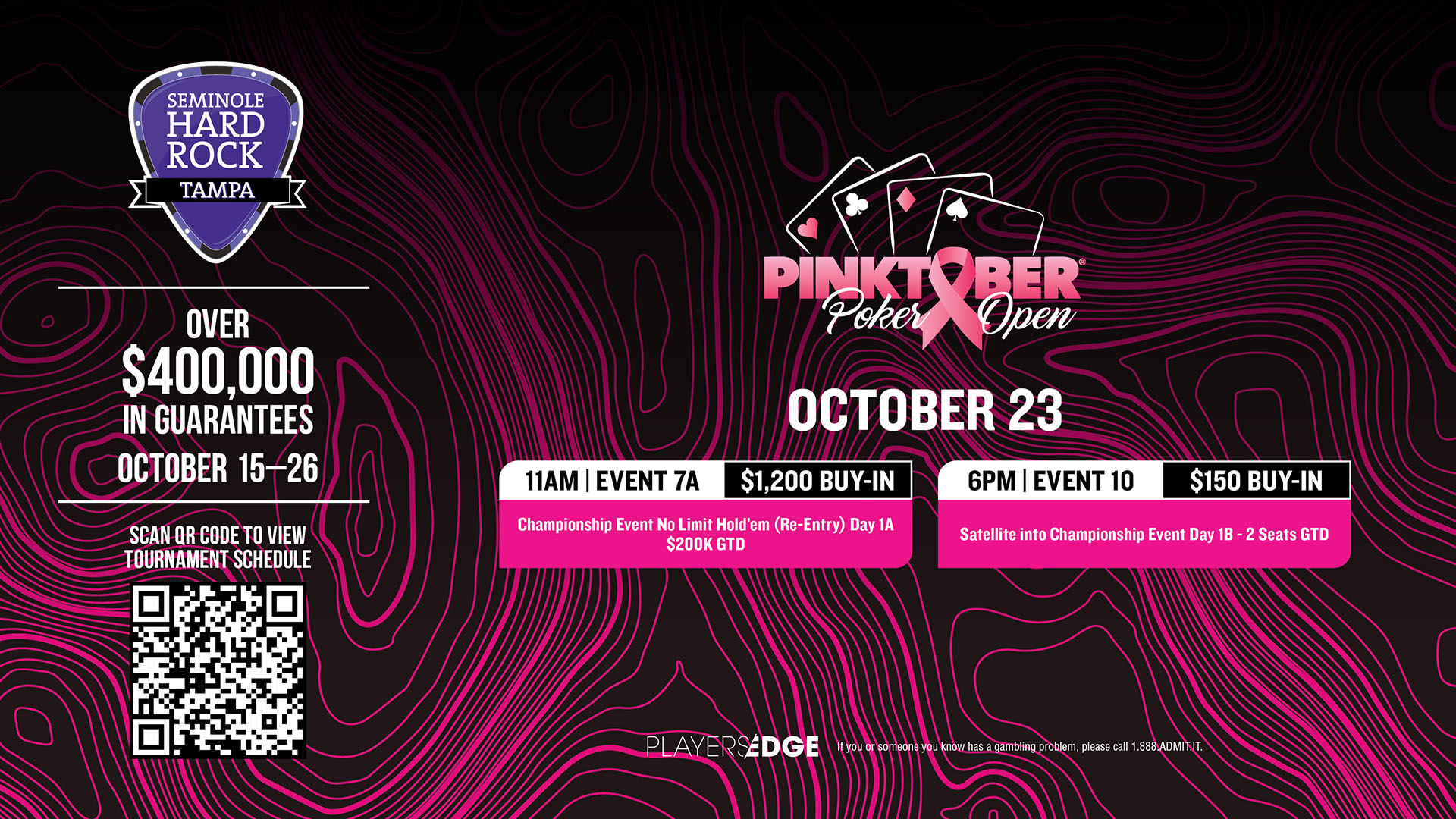The preliminary events are in the books and today we roll out the headliner. Flight A of the Pinktober Poker Open Championship starts at 11 am with a $1,200 buy-in and $200,000 guaranteed prize pool. Flight B runs tomorrow at the same time, and the last one is on Saturday.